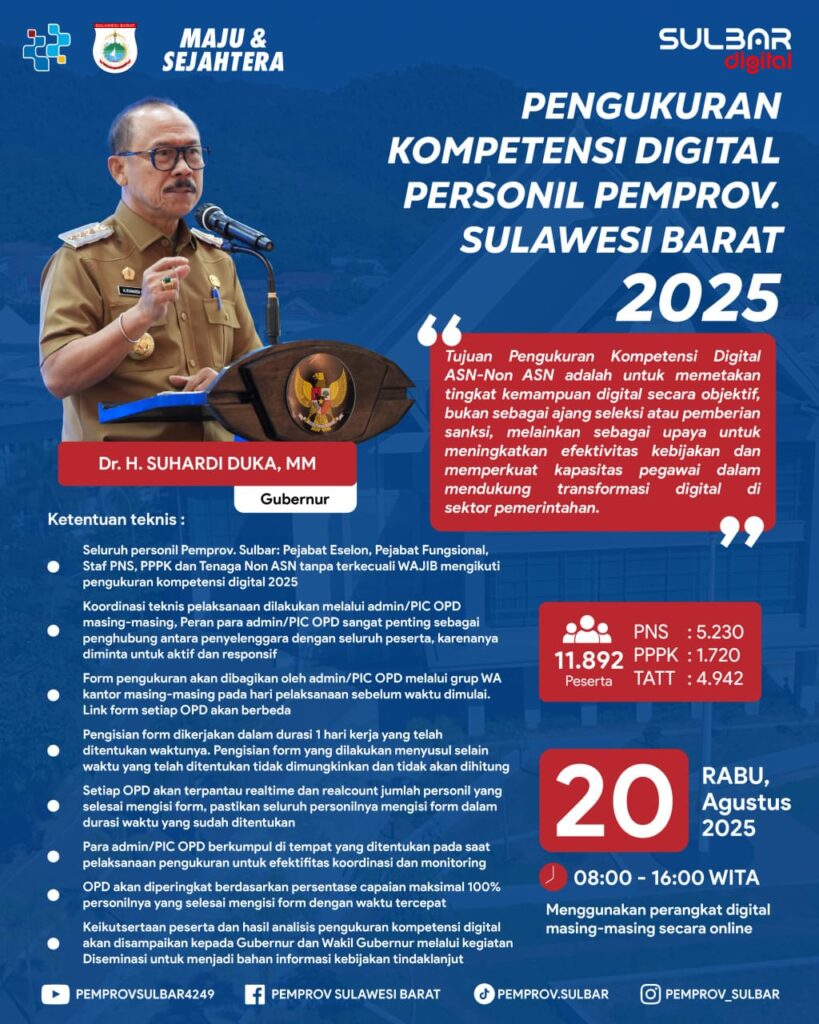 Mamuju – Pemerintah Provinsi Sulawesi Barat akan melaksanakan Pengukuran Kompetensi Digital Personil Pemprov Sulbar Tahun 2025 pada Rabu, 20 Agustus 2025,