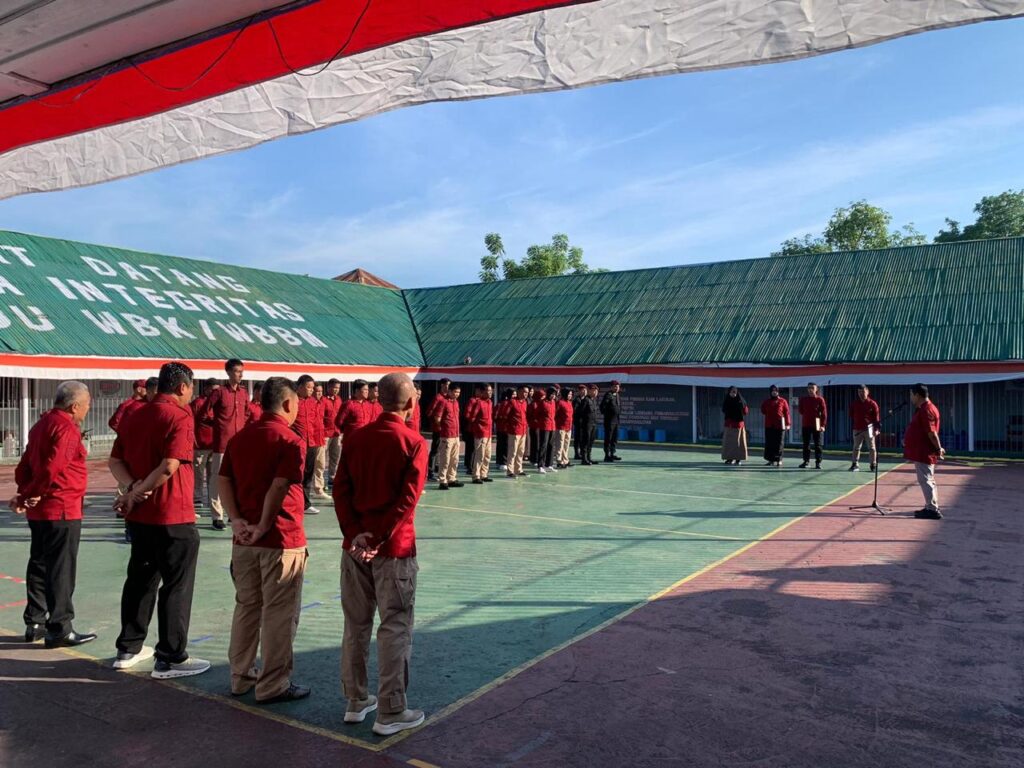 Majene – Kepala Divisi Pemasyarakatan (Bagus Kurniawan) yang didampingi oleh Kabid Pembinaan (Akhmad Heriansyah) Kabid Kabid Peltahkeswat, Lola, Kamtib (Tubagus M Chaidir), memimpin apel pagi yang diikuti oleh Kepala Rutan Kelas IIB Majene (Syahruddin) beserta seluruh jajaran Rutan Kelas IIB Majene.