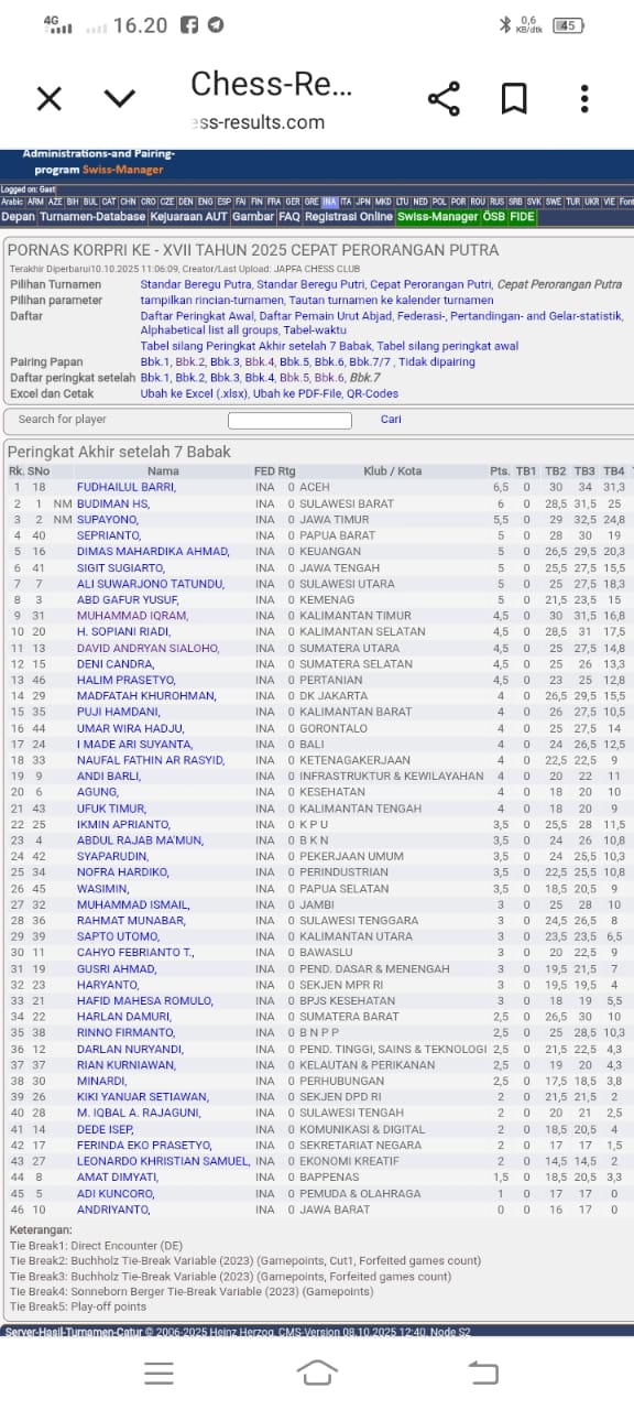 Palembang – Atlit Catur Sulbar Master Nasional (MN) Budiman Hs, berhasil meraih medali Perak pada Cabor catur Perorangan di PORNAS KORPRI XVII Palembang 2025, dengan poin 6 setelah melalui 7 babak. Budiman setingkat di bawah pecatur Provinsi NAD fudaIlul Barri dengan poin 6.5 yang meraih medali emas dan di Bawah Budiman Pecatur Jatim Supayono yang meraih medali Perunggu dengan poin selish tipis dari Budiman, yakni 5.5.