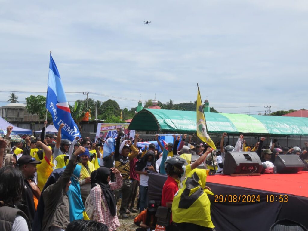 Mamuju Tengah – Suasana penuh semangat tampak di acara deklarasi pasangan calon Bupati dan Wakil Bupati Mamuju Tengah, Arsal Aras dan Askary Anwar, yang berlangsung meriah pada Kamis (29/8).