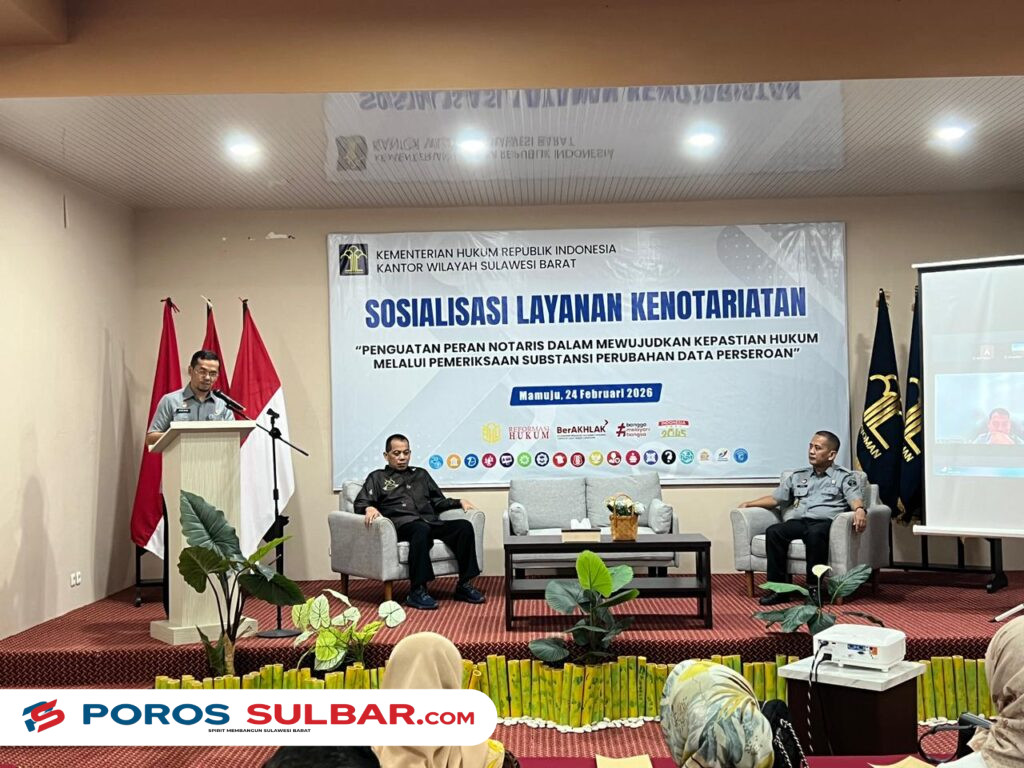 Hal itu disampaikan Kakanwil Saefur saat membuka Sosialisasi Layanan Kenotariatan bertema “Penguatan Peran Notaris dalam Mewujudkan Kepastian Hukum melalui Pemeriksaan Substansi Perubahan Data Perseroan.” Yang dilaksanakan Selasa, 24 Februari 2026, di Aula Tobadak, Hotel Aflah Mamuju.