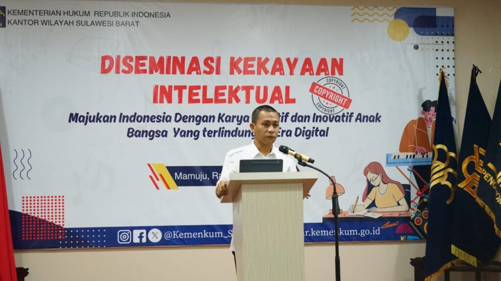 Mamuju, 18 Juni 2025 – Kantor Wilayah Kementerian Hukum (Kanwil Kemenkum) Sulawesi Barat hari ini melaksanakan Diseminasi Kekayaan Intelektual (KI) dengan tema “Majukan Indonesia dengan Karya Kreatif dan Inovatif Anak Bangsa yang Terlindungi di Era Digital”. Acara yang berlangsung di Hotel Afla Mamuju ini dibuka langsung oleh Kakanwil Kemenkum Sulawesi Barat, Sunu Tedy Maranto.