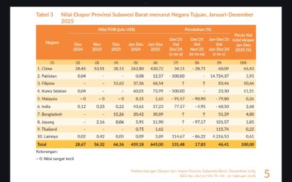 News News Kinerja Perdagangan Luar Negeri Sulbar Menguat, Ekspor Dominan Sawit dan Produk Turunannya By Poros Sulbar • February 5, 2026 • Mamuju – Kinerja perdagangan luar negeri Provinsi Sulawesi Barat menunjukkan tren positif sepanjang 2025. Nilai...