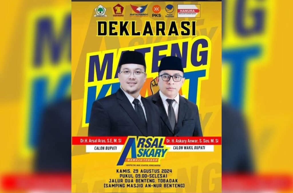 MAMUJU TENGAH — Pasangan Arsal Aras dan Askary Anwar akan secara resmi mendaftar sebagai calon Bupati dan Wakil Bupati Mamuju Tengah pada tanggal 29 Agustus 2024.