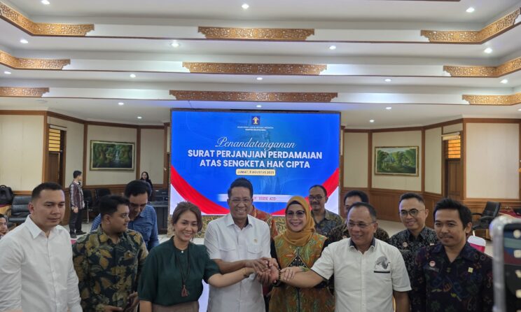 Bali – Menteri Hukum (Menkum), Supratman Andi Agtas, menyaksikan penandatanganan Surat Perjanjian Perdamaian atas Sengketa Hak Cipta antara Lembaga Manajemen Kolektif (LMK) Sentra Lisensi Musik Indonesia (SELMI) dan PT Mitra Bali Sukses (MBS) yang memegang lisensi merek Mie Gacoan, Jumat (08/08/2025).