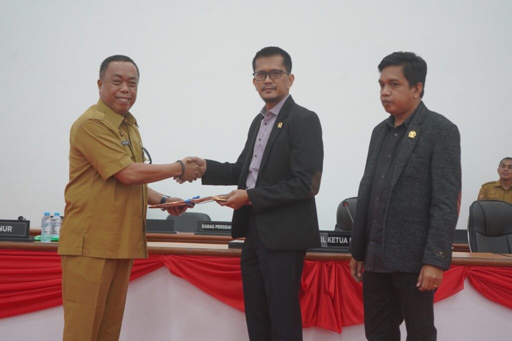 Mamuju — Mewakili Gubernur Sulbar Suhardi Duka (SDK), Asisten Pemkesra Muh Jaun menghadiri rapat paripurna dalam rangka penjelasan Gubernur terhadap Ranperda tentang penyertaan modal daerah pada PT Bank Pembangunan Daerah Sulselbar di kantor DPRD Sulbar, Senin 7 Juli 2025.