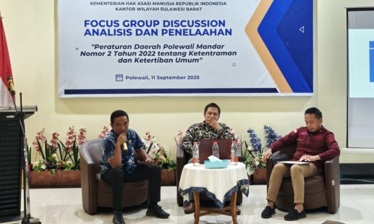 Polewali, 11 September 2025 – Kantor Wilayah Kementerian Hukum Sulawesi Barat menghadiri FGD Analisis dan telaah Perda Polman Nomor 2 tahun 2022 tentang Ketentraman dan ketertiban Umum yang dilaksanakan di Ratih Hotel Polman. Pelaksanaan kegiatan itu dihadiri oleh Koordinator Perancang Peraturan Perundang-Undangan, Irsyadi Ramadhany mewakili Kakanwil Kemenkum Sulbar, Sunu Tedy Maranto