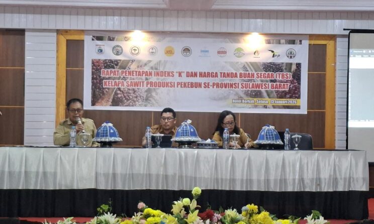 Mamuju — Dinas Perkebunan Provinsi Sulawesi Barat melaksanakan Rapat Penetapan Harga Tandan Buah Segar (TBS) Kelapa Sawit Produksi Pekebun Mitra Periode Januari 2026 pada Selasa, 13 Januari 2026, bertempat di Hotel Berkah, Mamuju. Kegiatan ini dipimpin dan dibuka langsung Kepala Dinas Perkebunan Sulawesi Barat, Muh. Faizal Thamrin, didampingi oleh Kepala Bidang Pengolahan dan Pemasaran Hasil Perkebunan, Agustina Palimbong.