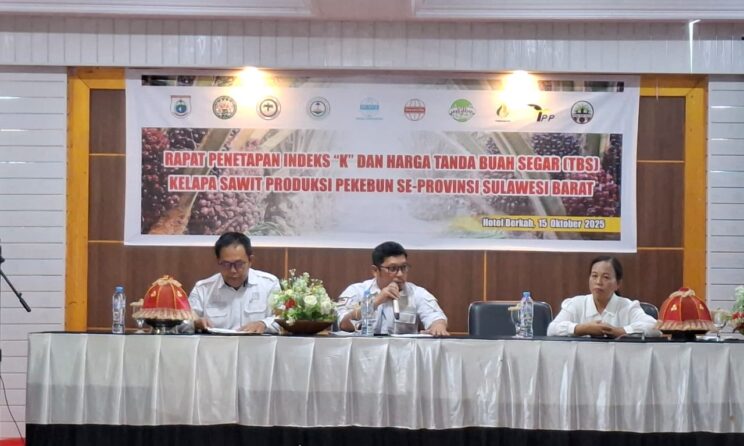 Mamuju – Dinas Perkebunan Sulawesi Barat (Sulbar) melaksanakan Rapat Penetapan Indeks “K” dan Harga Tandan Buah Segar (TBS) Kelapa Sawit Produksi Pekebun Se-Sulbar Periode Oktober 2025, di Hotel Berkah, Jln. Soekarno Hatta Mamuju, Rabu 15 Oktober 2025.