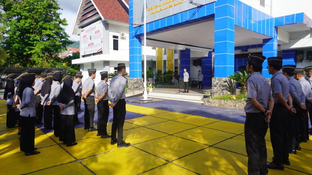 Mamuju – Kepala Divisi Administrasi Kanwil Kemenkumham Sulawesi Barat Rudi Hartono memberikan arahan pada apel pagi pada Senin (18/11/2024).