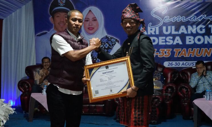 Penyerahan sertifikat penghargaan itu diserahkan di acara puncak hari ulang tahun desa Bonda ke 33 di pelataran kantor desa Bonda Mamuju.