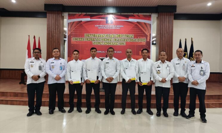Mamuju, 1 Oktober 2025 – Kakanwil Kemenkum Sulbar, Sunu Tedy menyampaikan apresiasinya kepada sejumlah Pegawai Pemerintah dengan Perjanjian Kerja (PPPK) di jajarannya. Hal itu disampaikannya saat penyerahan Surat Keputusan Menteri Hukum tentang pengangkatan PPPK di Aula Pengayoman.