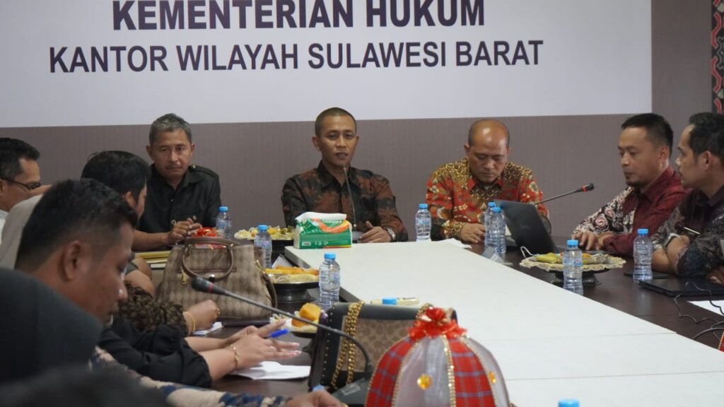 Mamuju, Sulawesi Barat – Kepala Kantor Wilayah Kementerian Hukum Sulawesi Barat, Sunu Tedy Maranto, didampingi oleh P3H, John Batara Manikallo bersama sejumlah perancang peraturan perundang-undangan Kanwil Kemenkum Sulbar menerima kunjungan kerja Badan Pembentukan Peraturan Daerah (Bapemperda) Dewan Perwakilan Rakyat Daerah (DPRD) Kabupaten Majene pada Kamis, 17 Juli 2025, di Ruang Rapat Baharuddin Lopa.