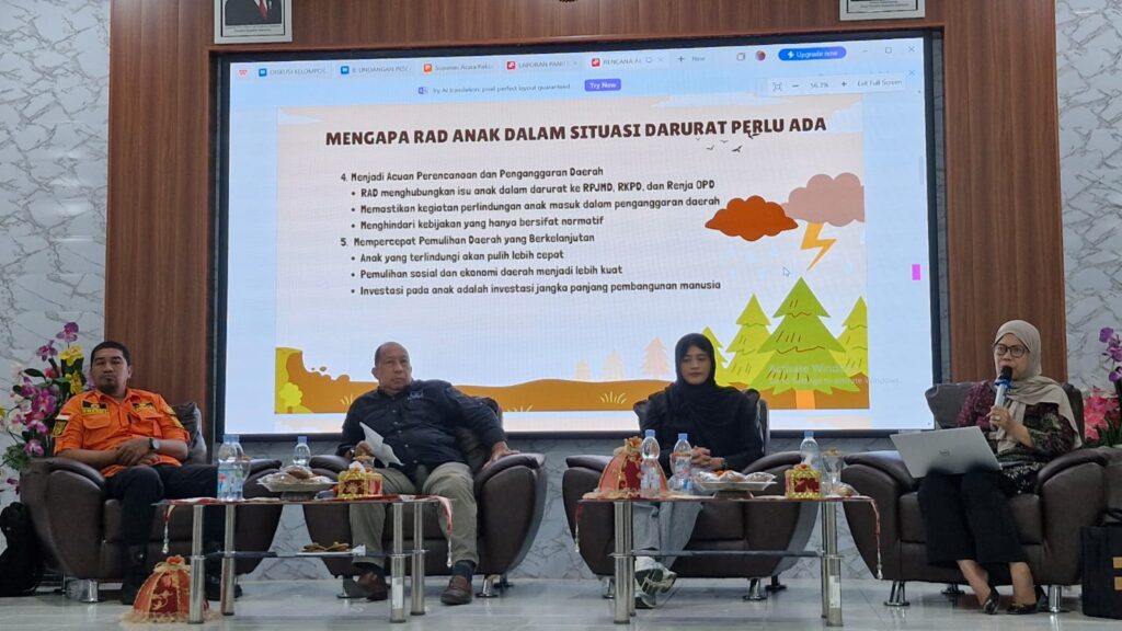 Sedangkan, materi Kedua dibawakan oleh Alma selaku perwakilan BAPPERIDA Provinsi Sulawesi Barat yang membahas mengenai RAD (Rencana Aksi Daerah) Anak Dalam Situasi Darurat.
