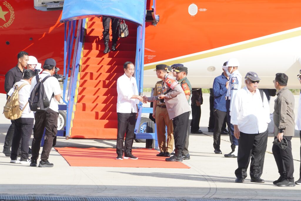 Polda Sulbar – Kapolda Sulbar Irjen Pol Adang Ginanjar bersama PJ. Gubernur, Danrem 142 Tatag, Ketua DPRD Sulbar dan forkopimda lainnya memberikan sambutan hangat kepada Presiden RI Joko Widodo saat tiba di Bandar Udara Tampa Padang Mamuju, Senin sore (22/2/24).