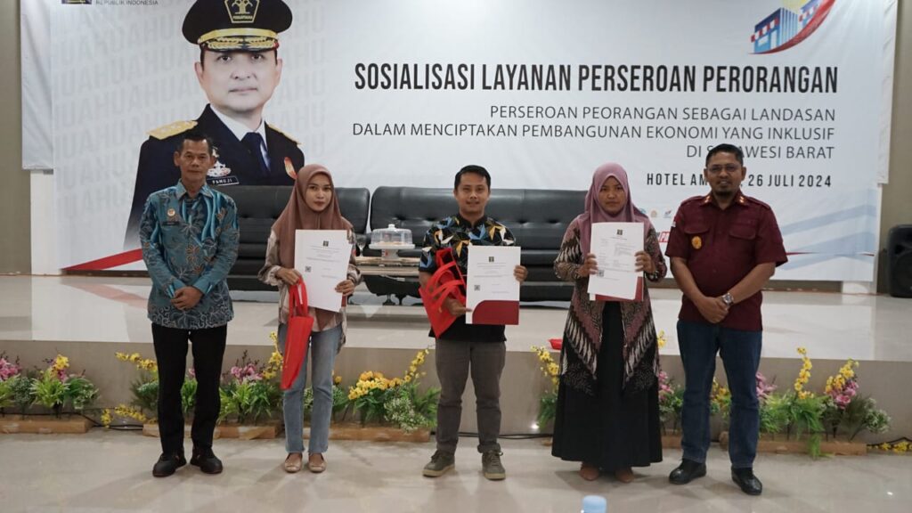 Dalam kesempatan ini Kepala Divisi Administrasi Rudi Hartono juga memberikan langsung sertifikat pendaftaran perseroan perorangan kepada peserta yang telah melakukan pendaftaran , “Ia memohon kepada peserta yang hadir, baik dari kalangan pengusaha mikro dan kecil, pemerintah daerah dan penggiat UMK agar dapat menyebarluaskan informasi mengenai pendaftaran perseroan perorangan kepada orang-orang disekitarnya agar mereka mendapatkan manfaat kemudahan berusaha dari sisi badan hukumnya, serta melalui sosialisasi hari ini dapat kita manfaatkan dengan baik untuk membangun sulawesi barat yang lebih baik.