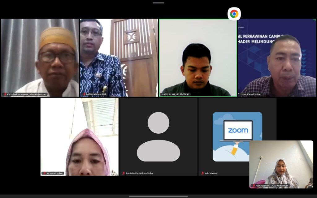 Makassar – Kantor Wilayah Kementerian Hukum pada Bidang Pelayanan Kekayaan Intelektual (KI) menggelar rapat koordinasi secara daring pada hari Jumat, 2 Mei 2025, pukul 10.00 WITA. Rapat ini bertujuan untuk melakukan pendampingan pencatatan Kekayaan Intelektual Komunal (KIK) Kabupaten Majene.