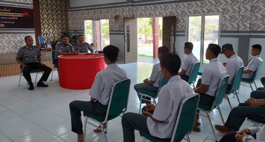 Mamuju – Kepala Seksi Pengawasan dan Penegakan Disiplin (Kasi Wasgakin), Baskoro, memberikan pengarahan kepada anak binaan di Lembaga Pembinaan Khusus Anak (LPKA) Kelas II Mamuj.