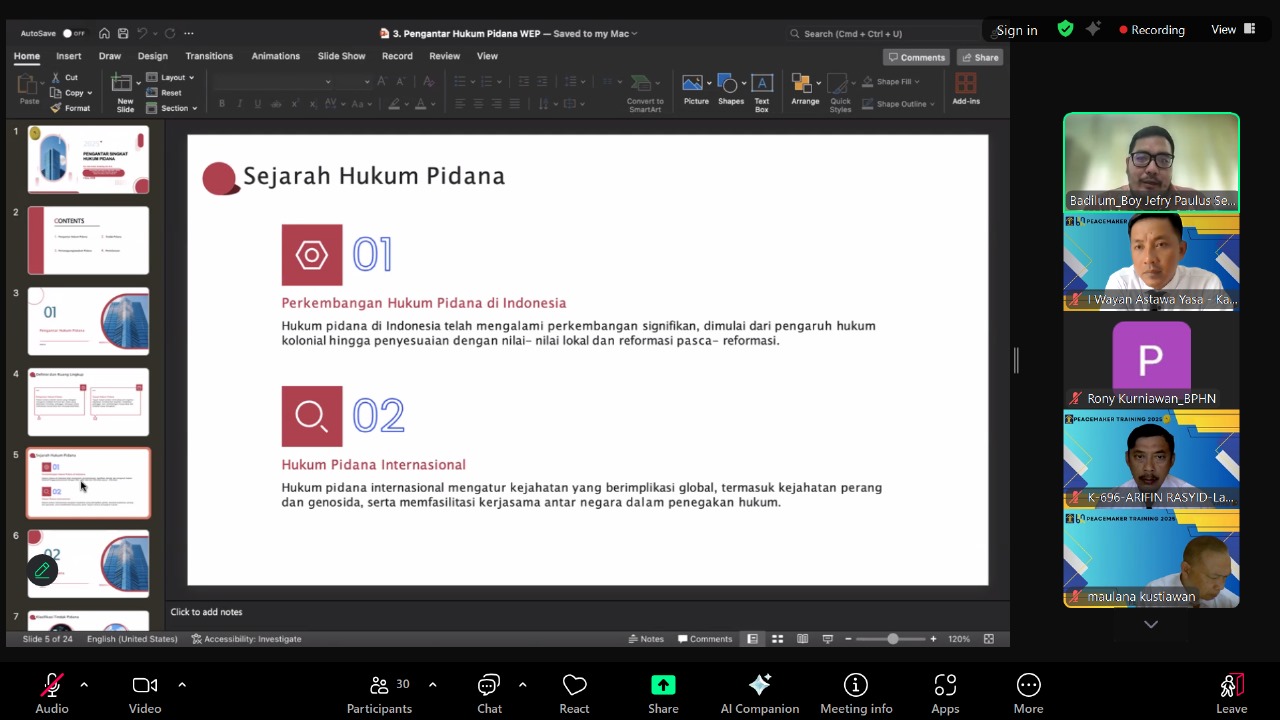 Materi yang disampaikan dalam pelatihan ini mencakup Pengantar Negara Hukum dan Pancasila, Pengantar Singkat Hukum Pidana, serta Pengantar Singkat Hukum Perdata. Kehadiran narasumber dari Mahkamah Agung RI menegaskan kualitas dan relevansi materi yang diberikan.