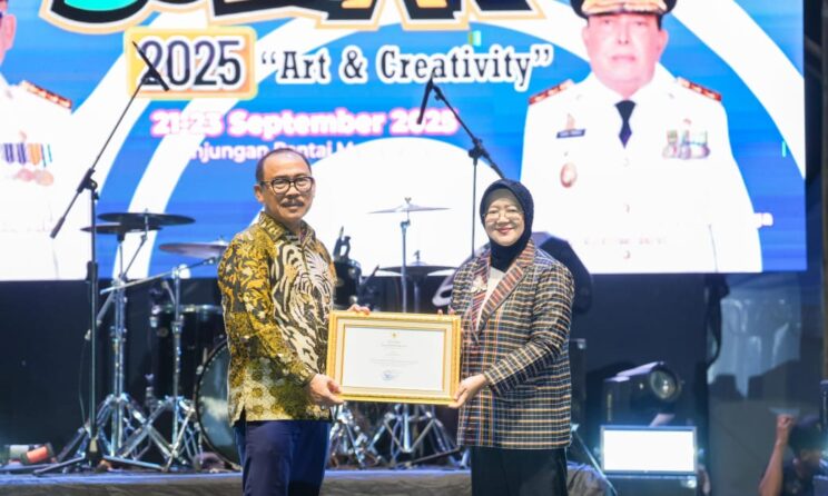 Penyerahan diberikan Staf Ahli Menteri Pariwisata Bidang Reformasi Birokrasi dan Regulasi Kurleni Ukar kepada Gubernur Sulbar, Suhardi Duka di pembukaan Gema Sulbar di pantai Anjungan Manakarra, Minggu 21 September 2025 malam.