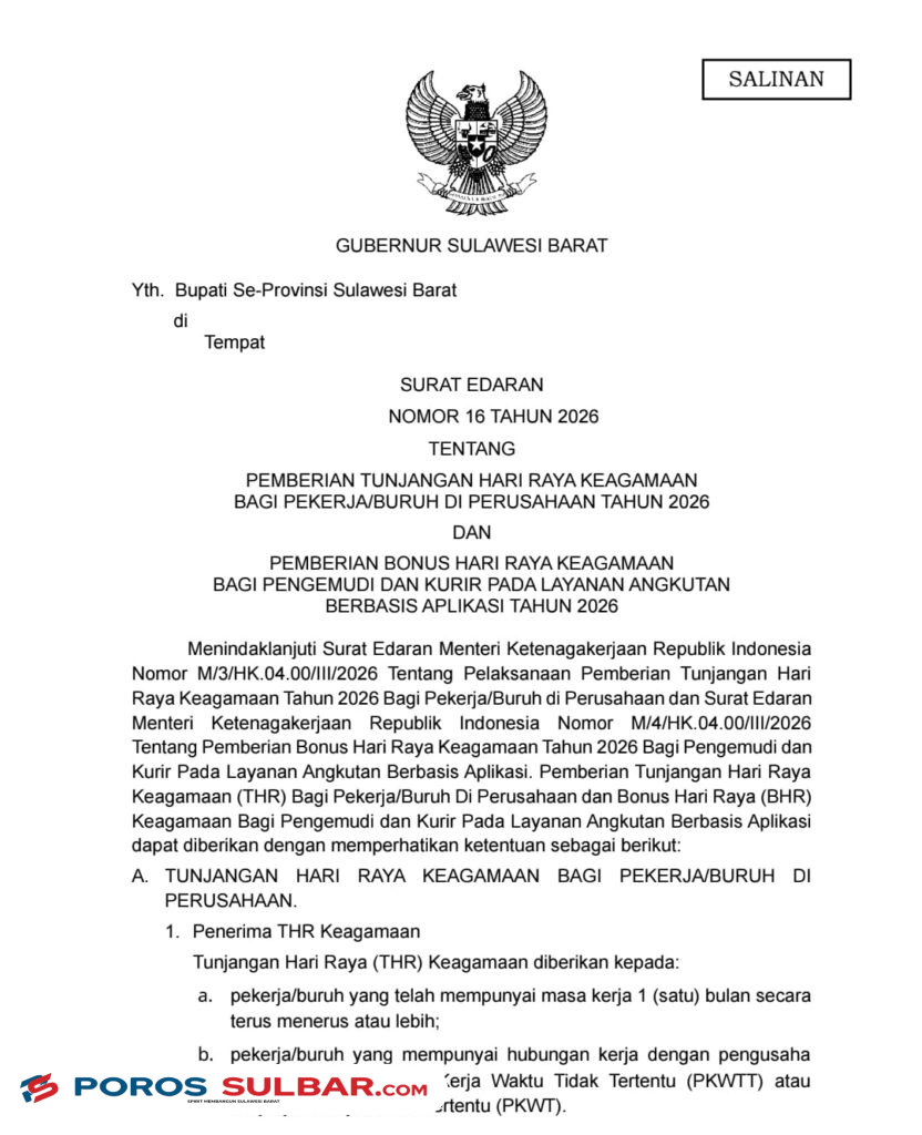 Mamuju – Pemerintah Provinsi Sulawesi Barat menegaskan komitmennya dalam melindungi dan meningkatkan kesejahteraan pekerja melalui penerbitan Surat Edaran Gubernur Sulawesi Barat Nomor 16 Tahun 2026 tentang Pemberian Tunjangan Hari Raya (THR) Keagamaan bagi Pekerja/Buruh di Perusahaan serta Bonus Hari Raya (BHR) Keagamaan bagi Pengemudi dan Kurir pada Layanan Angkutan Berbasis Aplikasi Tahun 2026.