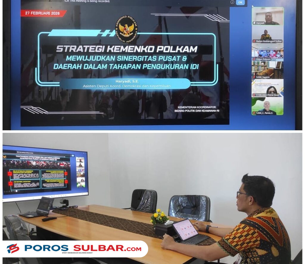 MAMUJU, — Kepala Badan Kesatuan Bangsa dan Politik (Kesbangpol) Provinsi Sulawesi Barat, Darwis Damir, menghadiri kegiatan Monitoring dan Evaluasi (Monev) Hasil Pelaksanaan Focus Group Discussion (FGD) Indeks Demokrasi Indonesia (IDI) Tingkat Provinsi Tahun 2025. Kegiatan tersebut dilaksanakan secara daring oleh Direktorat Jenderal Politik dan Pemerintahan Umum Kementerian Dalam Negeri Republik Indonesia, Jumat (27/2/2026) di Kantor Badan Kesbangpol Sulbar