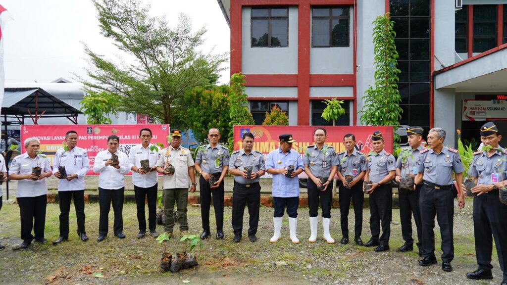 Mamuju – Penjabat Gubernur Sulawesi Barat Bahtiar Baharuddin bersama Kepala Kantor Wilayah Kementerian Hukum dan HAM Sulawesi Barat, Pamuji Raharja beserta jajaran melakukan penanaman pohon sukun di Lembaga Pemasyarakatan Perempuan Kelas III Mamuju, Rabu (3/7/2024).