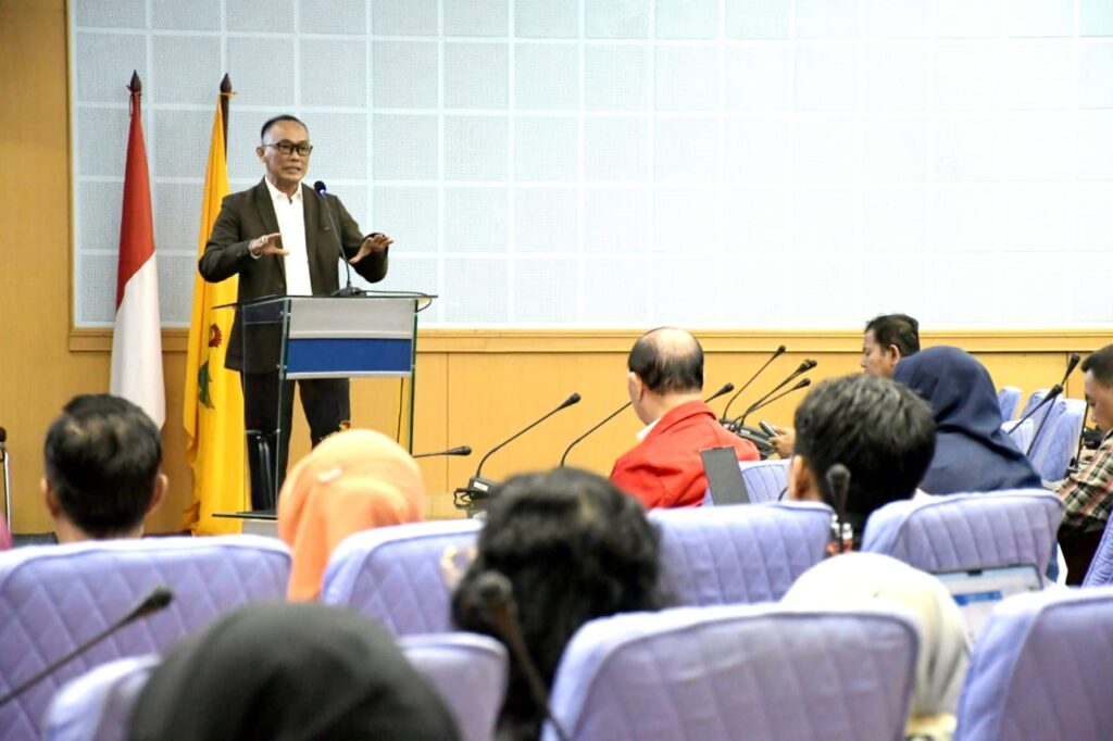 Makassar — Pj Gubernur Prof Zudan Arif Fakrulloh, membawakan kuliah umum dikampus Unhas di Ruang Rapat Senat, Kamis 4 April 2024.