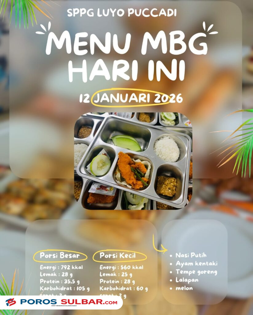 POROSSULBAR- POLMAN— SPPG Luyo Puccadi kembali menghadirkan menu bergizi dalam Program Makan Bergizi Gratis (MBG) pada Jumat, 12 Januari 2026. Menu yang disajikan dirancang untuk memenuhi Angka Kecukupan Gizi (AKG) peserta didik, baik untuk kategori porsi kecil maupun porsi besar.