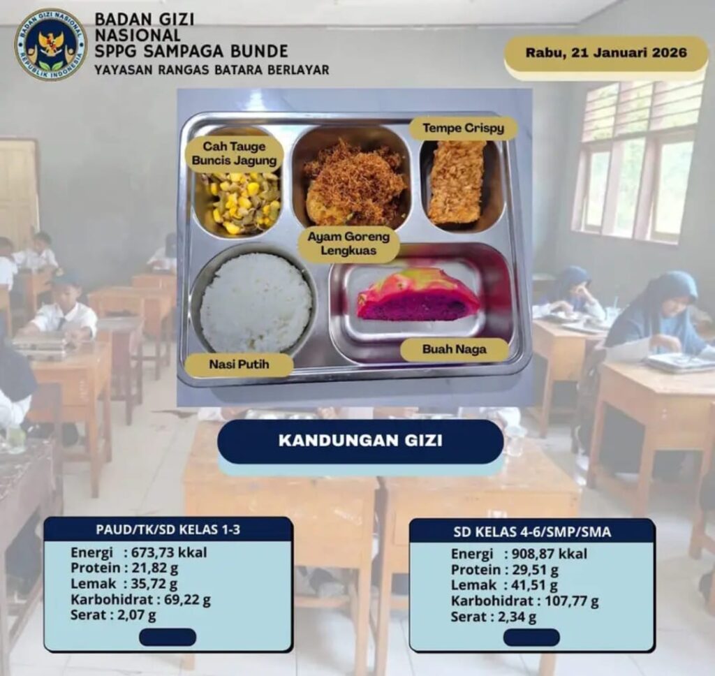 Mamuju – SulbarNews.id.– Satuan Pelayanan Program Gizi (SPPG) Sampaga Bunde yang berlokasi di Kecamatan Sampaga, Kabupaten Mamuju, terus berkomitmen menjalankan program pemenuhan gizi bagi peserta didik. Pada Rabu (21/01/2026), SPPG di bawah naungan Yayasan Rangas Batara Berlayar ini menyajikan menu makan siang bergizi seimbang yang dirancang khusus untuk mendukung tumbuh kembang siswa di berbagai jenjang pendidikan.