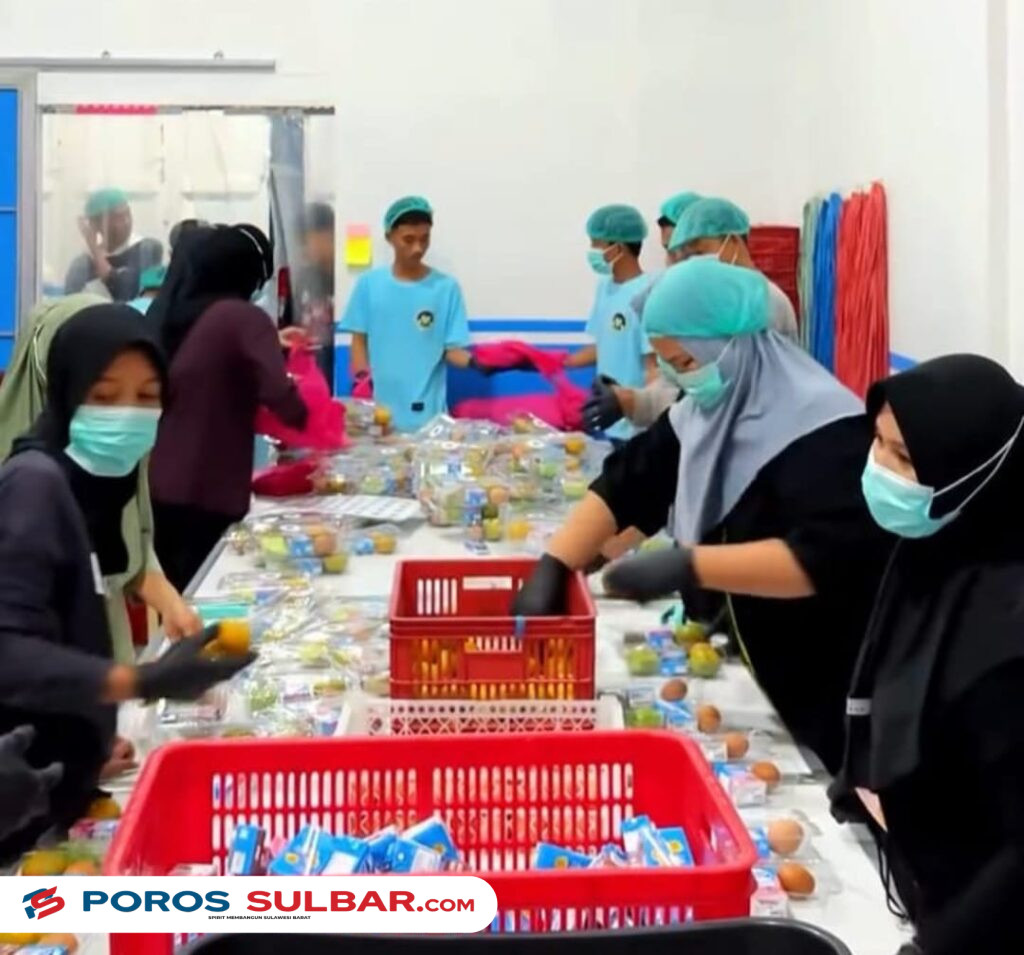 Pasangkayu – Porossulbar.com – Kegiatan penyiapan menu Program Makan Bergizi Gratis (MBG) di dapur Satuan Pelayanan Pemenuhan Gizi (SPPG) Pasangkayu Baras Kasano berlangsung dengan menerapkan standar kebersihan yang ketat. Dalam proses pengemasan makanan, para relawan dan petugas dapur terlihat menggunakan masker, sarung tangan, serta perlengkapan kerja yang higienis guna memastikan makanan yang disiapkan tetap aman dan berkualitas sebelum didistribusikan kepada para penerima manfaat.