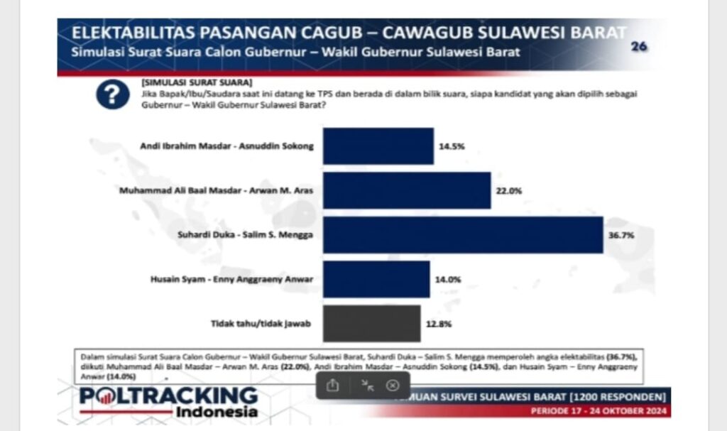 Dari hasil Survei Poltracking, pasangan SDK – JSM mengungguli tiga rivalnya di Pilkada Sulbar dengan raihan 36,7 persen suara.