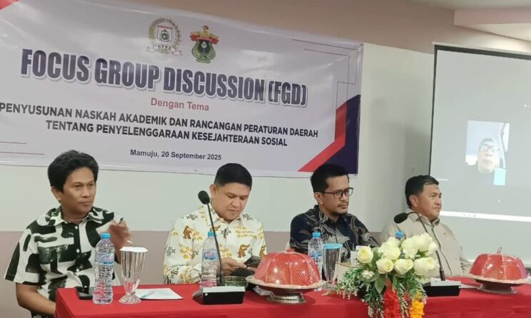 Mamuju —Sekretariat DPRD Provinsi Sulawesi Barat menggelar Focus Group Discussion (FGD) Penyusunan Naskah Akademik tentang Penyelenggaraan Kesejahteraan Sosial, bekerjasama dengan Lembaga Penelitian dan Pengabdian Masyarakat (LPPM) Universitas Hasanuddin, bertempat di Aula Hotel Quint Park Mamuju, Sabtu, 20 September 2025