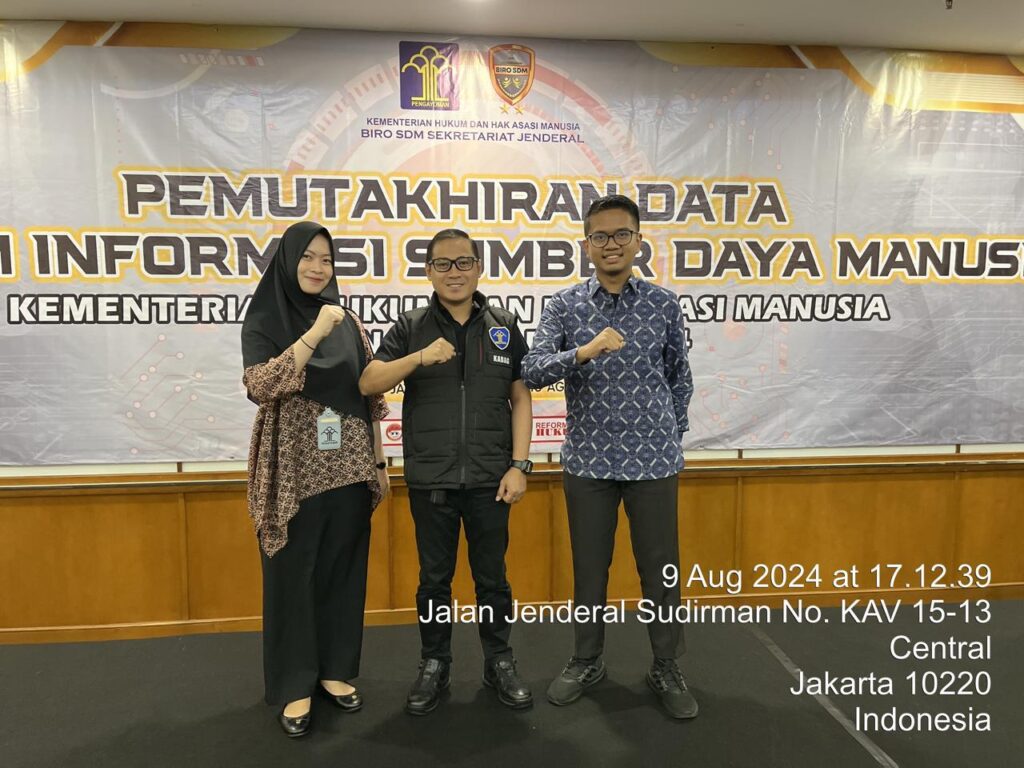 Jakarta – Kanwil Kemenkumham Sulbar menghadiri rangkaian hari ke-4 sekaligus penutupan Kegiatan Pemutakhiran Data Sistem Informasi Sumber Daya Manusia Kementerian Hukum Dan HAM Tahun Anggaran 2024, Jumat (9/8/2024).
